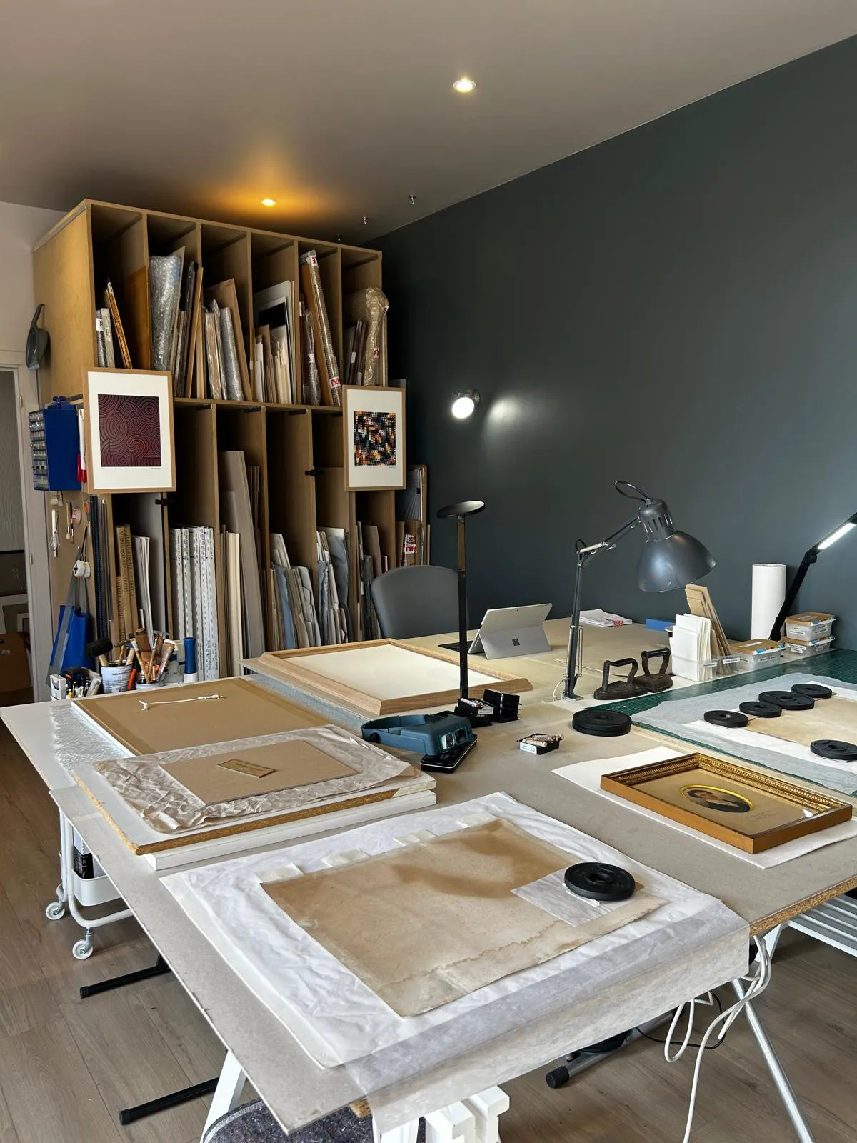 Depuis la fin de l’année 2021, nous disposons d’un local technique annexe situé à proximité immédiate de notre site principal. Ce nouvel espace est spécialement dédié aux arts graphiques ainsi qu’à la confection d’encadrements. Il n’est pas accessible au public.